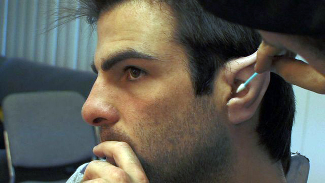 Ο ηθοποιός Zachary Quinto περιμένει υπομονετικά να του προσαρμόσουν τα περίφημα «αυτιά Vulcan» για τις ανάγκες της ταινίας...
