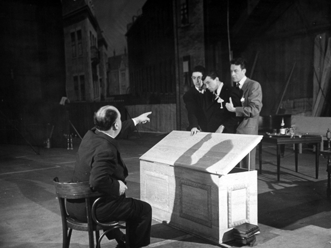 Ο σπουδαίος Άλφρεντ Χίτσκοκ δίνει τις τελευταίες σκηνοθετικές οδηγίες στο καστ του «Rope»...