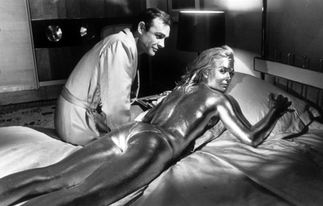 Ο Σον Κόνερι στο πλευρό της καλυμμένης με χρυσόσκονη βρετανής ηθοποιού Shirley Eaton, στο γύρισμα της μνημειώδους σκηνής...