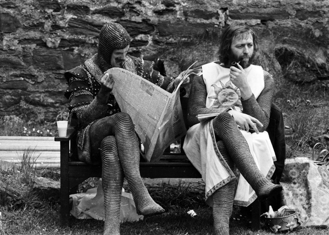 Διάλειμμα στα γυρίσματα της ξεκαρδιστικής κωμωδίας της σουρεαλιστικής ομάδας, με τον Τζον Κλιζ να διαβάζει την εφημερίδα του και τον Τσάπμαν να απολαμβάνει την πίπα του...