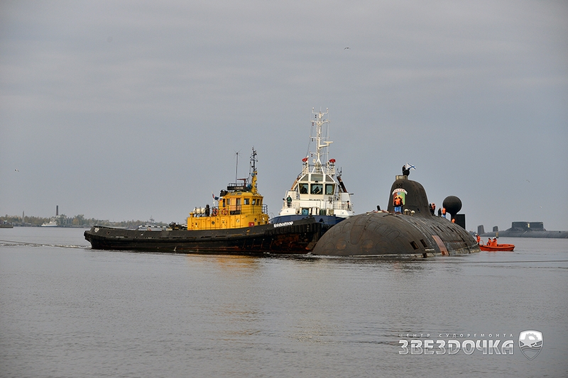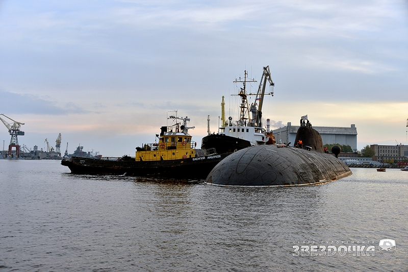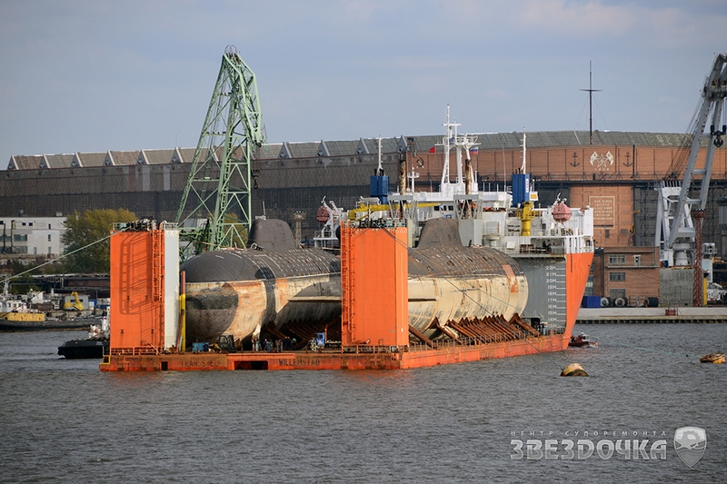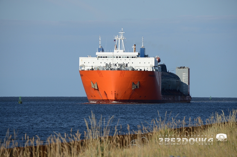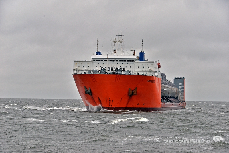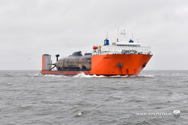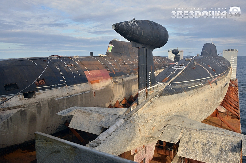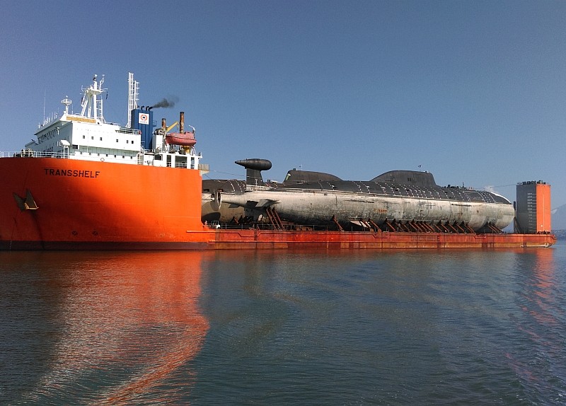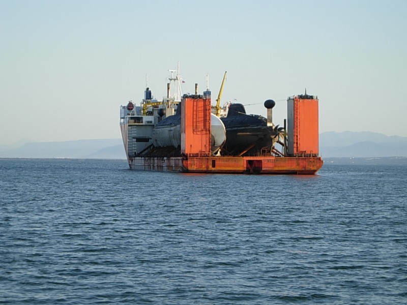 Two Russian submarines being transported through the Northern Sea Route from one part of Russia to another. The Northern Sea Route is where the ships go through the Northern Arctic ocean when it’s free of ice.