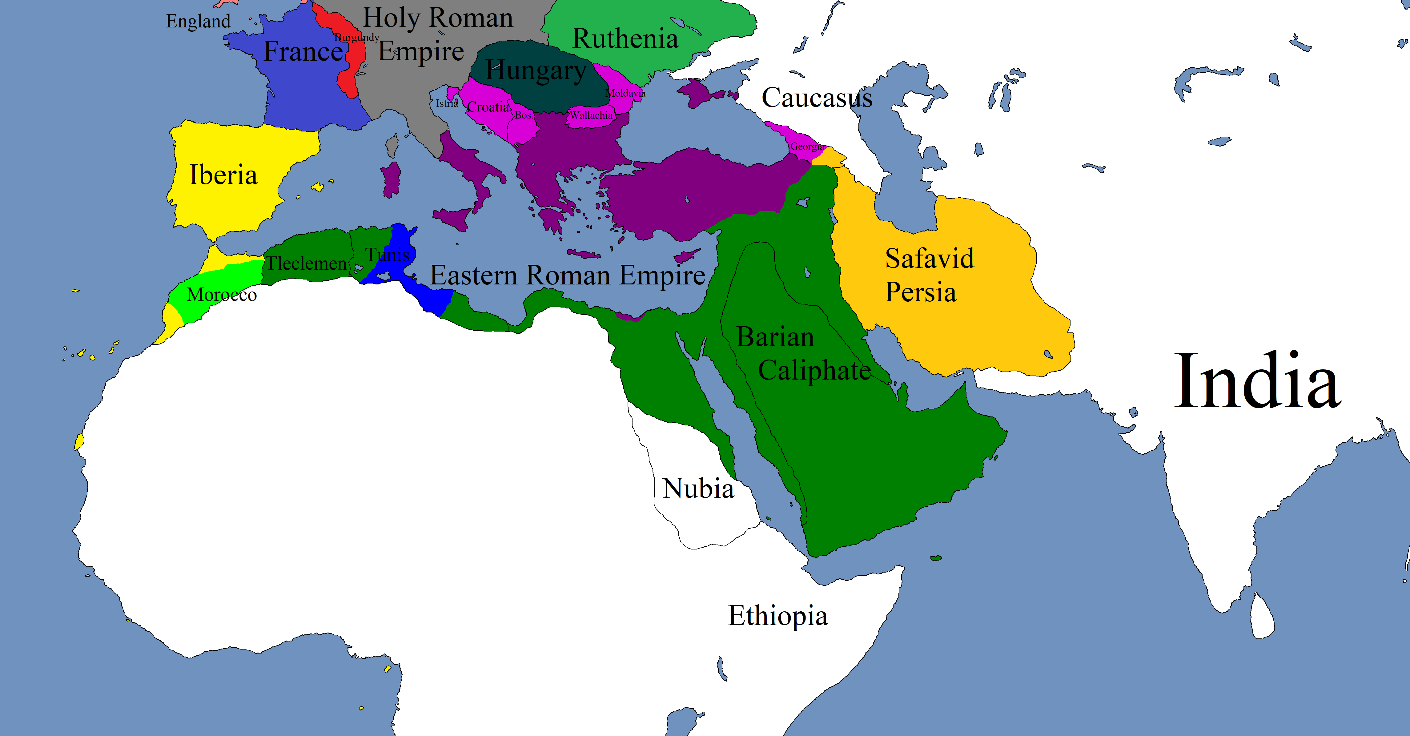 On August 5th, 1504, Muslih, son of the first Barian caliph, Waatiq el-Bari (who had suffered a greatly mourned death two months prior), delivered a speech at the Congress of Mecca, decrying the supposed sins of the Byzantines and declaring all infidels to be enemies of Allah, demanding that they perish. The subsequent time, known as the Slaughter of the Near East, saw the massacres of millions of Christians, Jews, and other religious minorities across the Islamic World. This intensified resistance against the Muslims. Do not let the map fool you, for plenty of revolts broke out throughout the Caliphate.