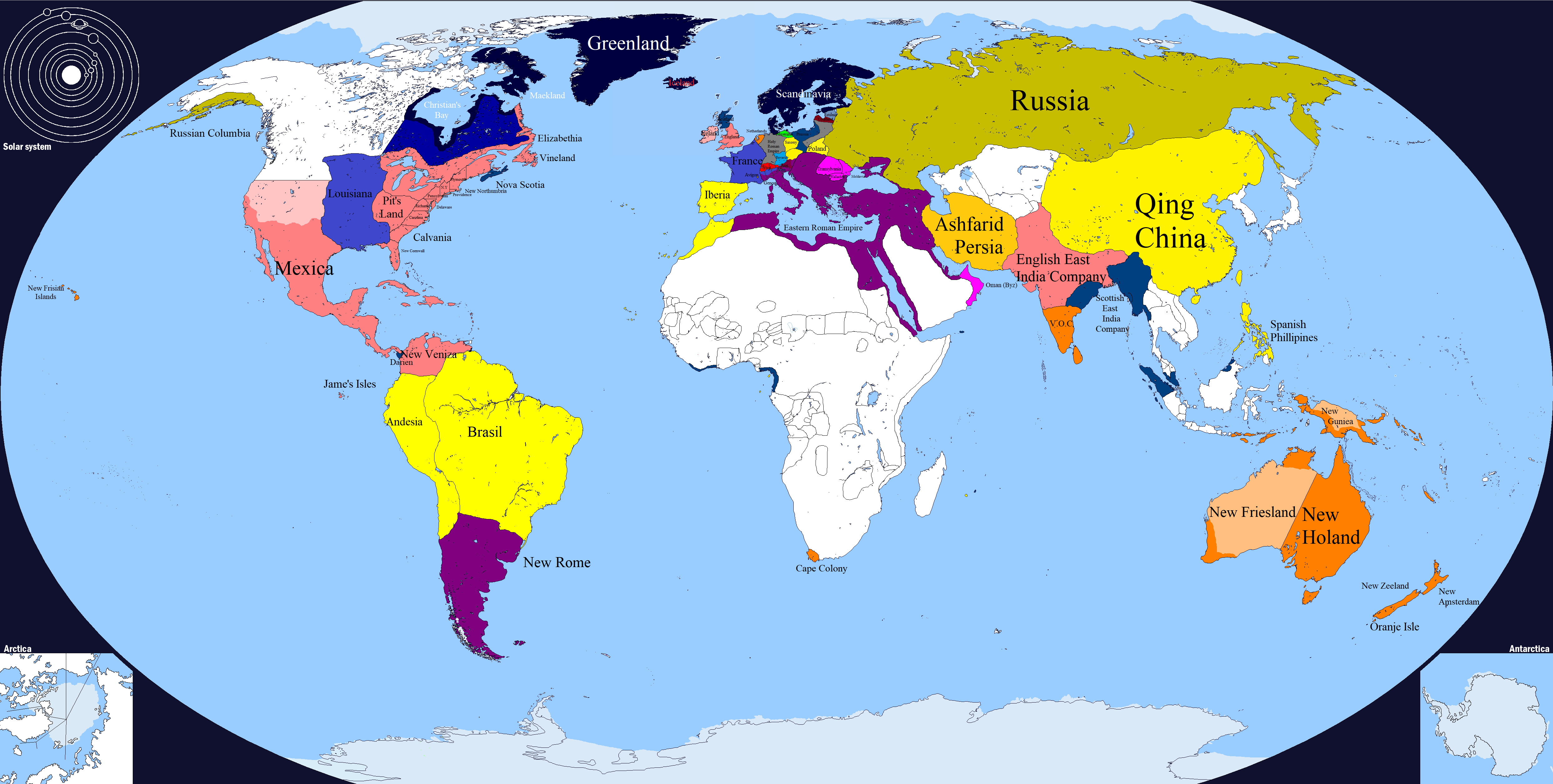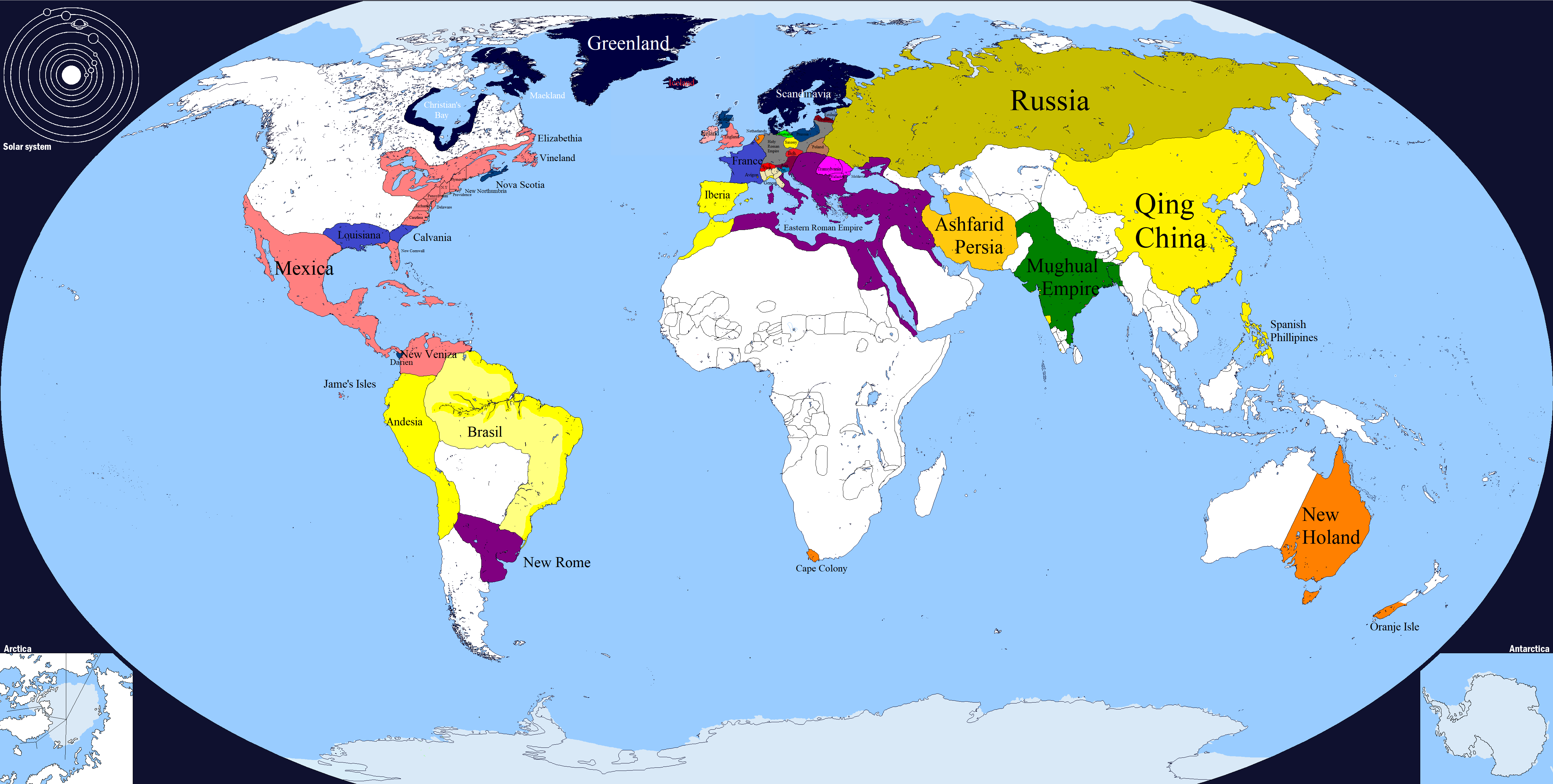 In 2002, the Arab tribes united under Mohamed Fareed al-Ally, establishing the Sultanate of Arabia. A brief war ensued with the Byzantines, resulting In minor territorial concessions. In the same year, a constitutional monarchy is established in Muscovy after the Kyiv and Novgorodian Revolutions. This lead to the deposed prince fleeing to independent Alyaska.