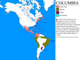 A Genoese merchant, Bartholomew Corombo, under orders from his older brother, Cristoffa Corombo (now deceased), sponsored by the English government, sails west across the ocean, landing in Newfoundland in 1506. Believing he was in Tartary (Mongolia), he sails further south, searching for Japan and China. He landed in the Bahamas and assumes its Sepengu (Japan) and after running aground in Korea (Florida), hit the Aztec Coasts in 1507. After sailing along the coast for a longer period than expected, he concluded that this is not Asia but instead an entirely new landmass, Columbia (named after the English pronunciation of his surname, Columbus). He sails back bringing the news to the English court. Amazed and impressed and wanting the riches of the Aztec Empire told by the Colombo and his crew, the English send Bartholomew back to what they called Mexica. They conquered the growing in 1509, and he was declared governor of Mexica the following year, while several others governed the various English colonies such as Henria (Bahamas), Avalon (Cuba) Vineland (Newfoundland), New Cornwall (Florida) and New Bristol (Cape Charles)